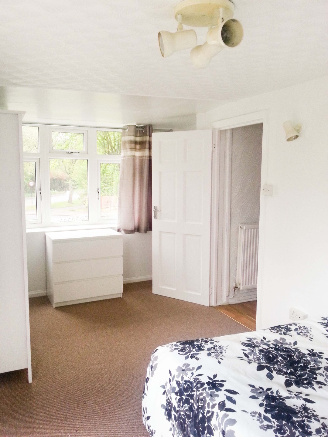 The room is on the ground floor with private entrance from the drive and is fully furnished with a king size bed, triple wardrobe and fridge/freezer.